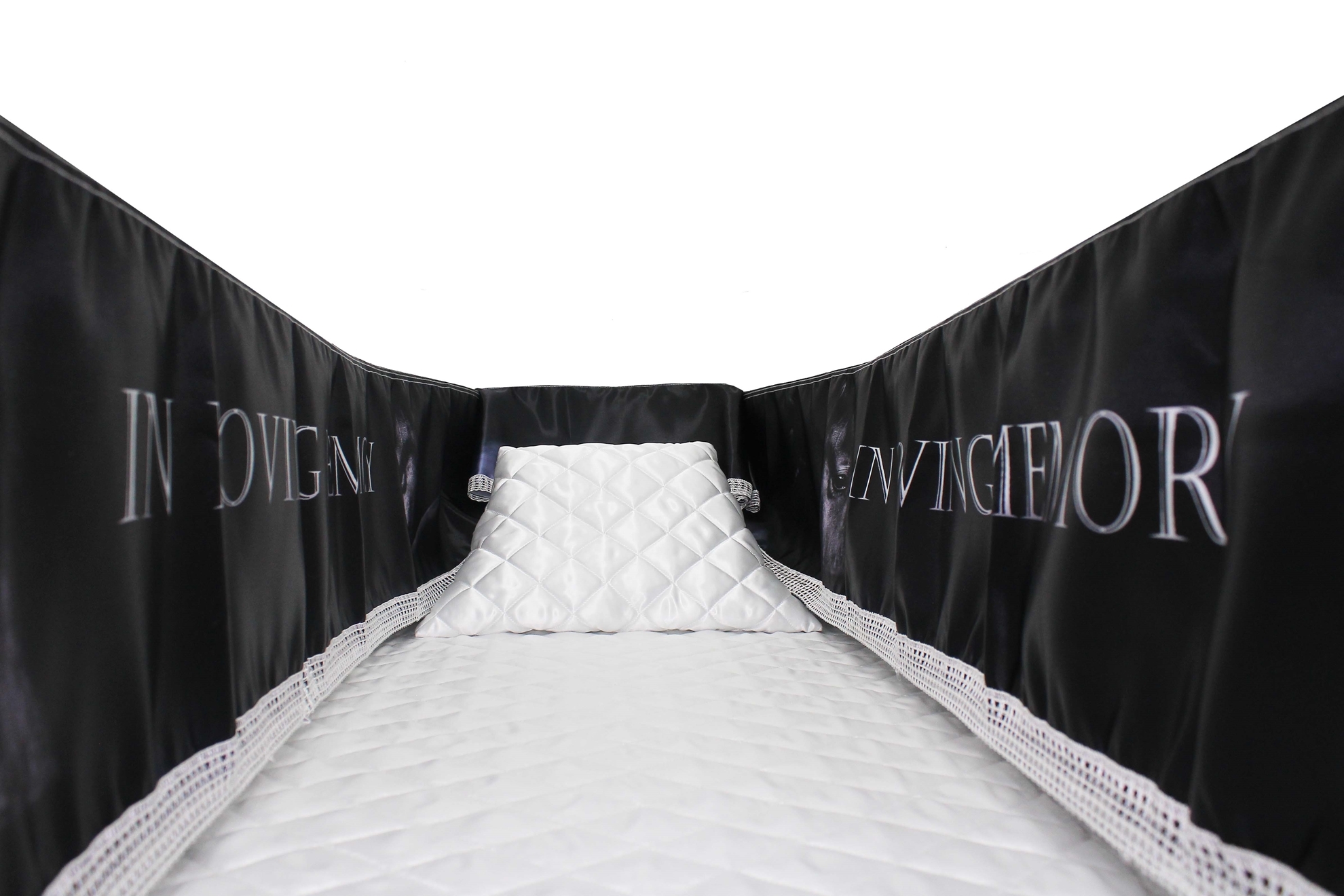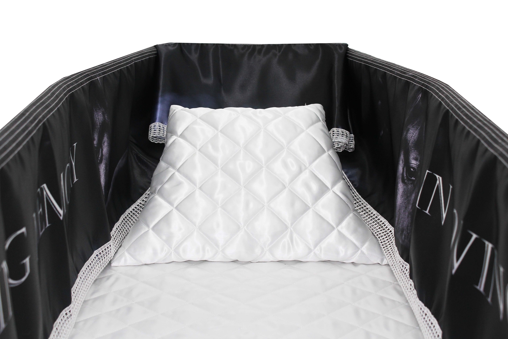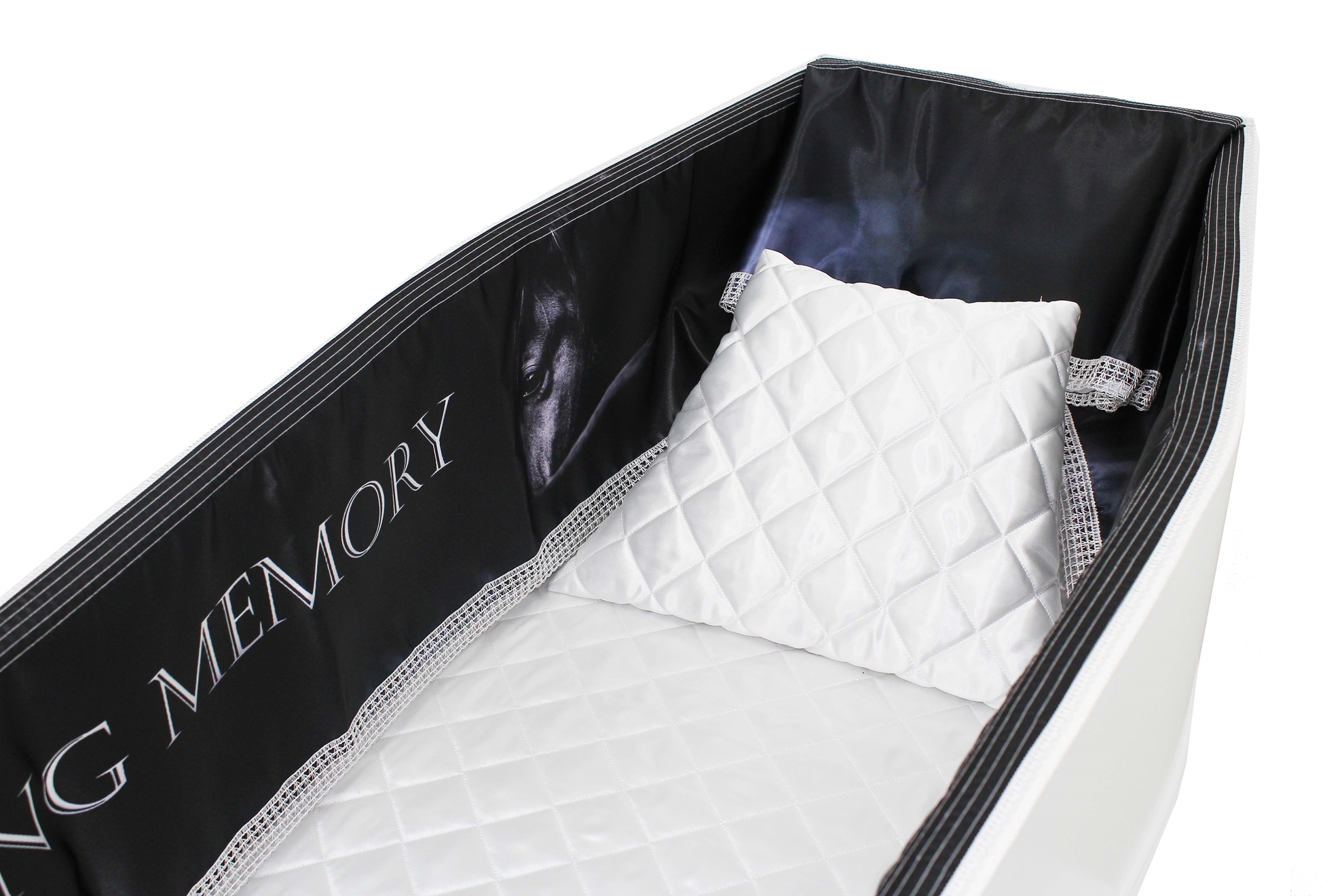 Luxury satin interior printed using water-based ink. The printed interior set consists of a 18-inch 2 Way printed satin frill, printed satin facecloth, quilted satin pillow and a quilted satin mattress.The chosen design will be printed on the interior. Image is to illustrate style of Interior Only.