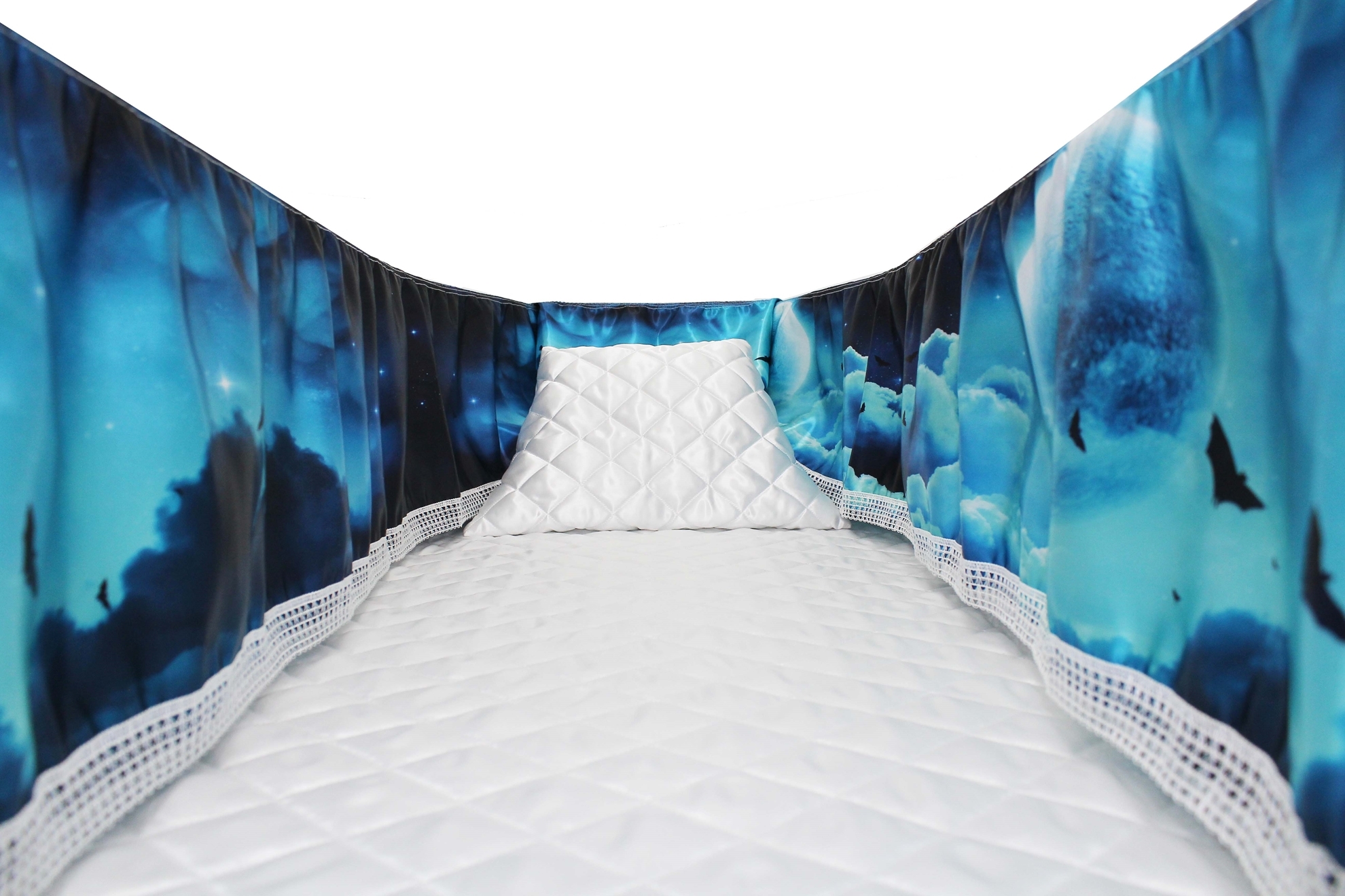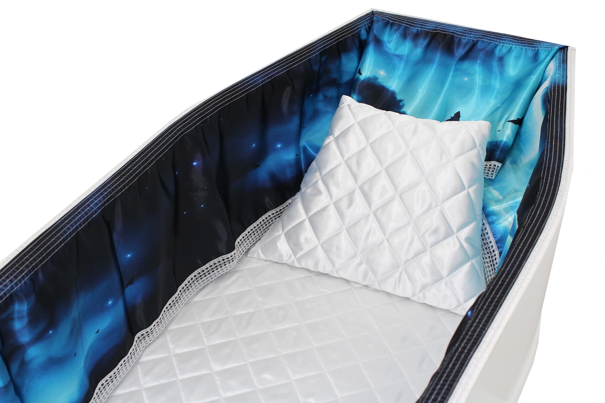 12-inch Printed Satin frill to be attached to the lip of the coffin/casket. Please note the image shows a mattress and pillow which are NOT included.