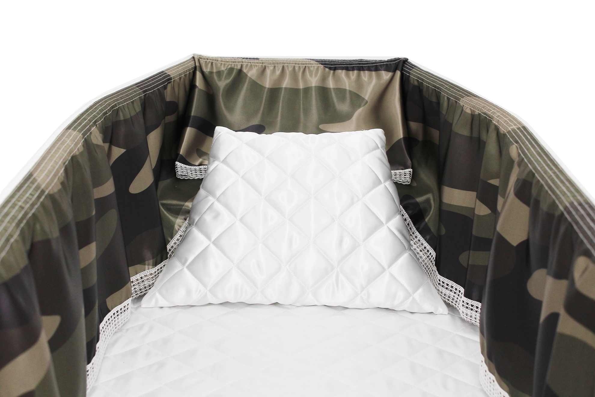 Luxury satin interior printed using water-based ink. The printed interior set consists of a 12-inch printed satin frill, printed satin facecloth, quilted satin pillow and a quilted satin mattress.