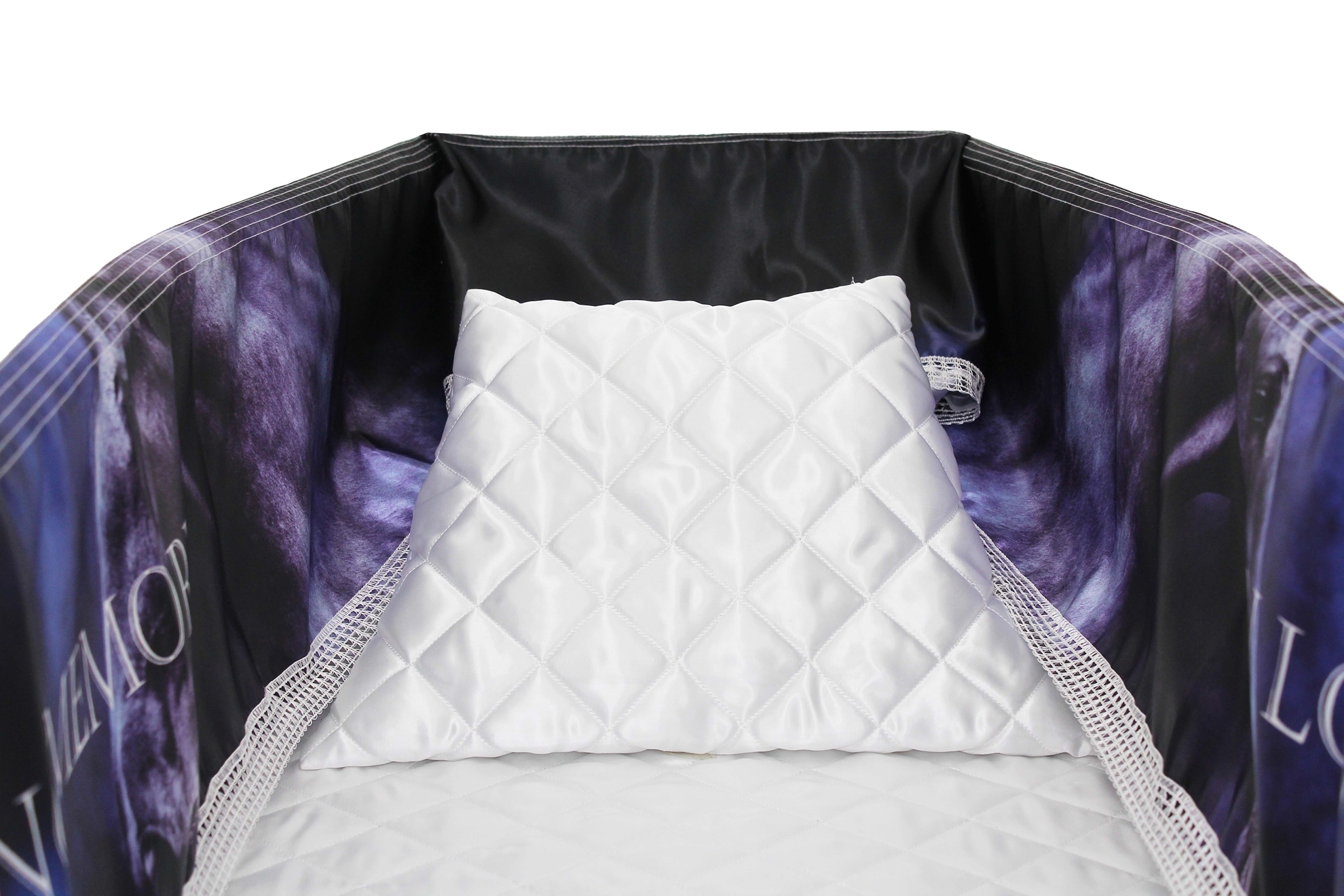 Luxury satin interior printed using water-based ink. The printed interior set consists of a 18-inch 2 Way printed satin frill, printed satin facecloth, quilted satin pillow and a quilted satin mattress.The chosen design will be printed on the interior. Image is to illustrate style of Interior Only.