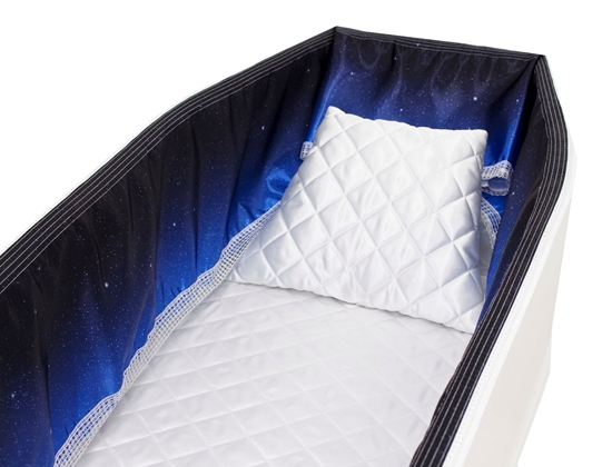 Luxury satin interior printed using water-based ink. The printed interior set consists of a 18-inch 2 Way printed satin frill, printed satin facecloth, quilted satin pillow and a quilted satin mattress.The chosen design will be printed on the interior. Image is to illustrate style of Interior Only.