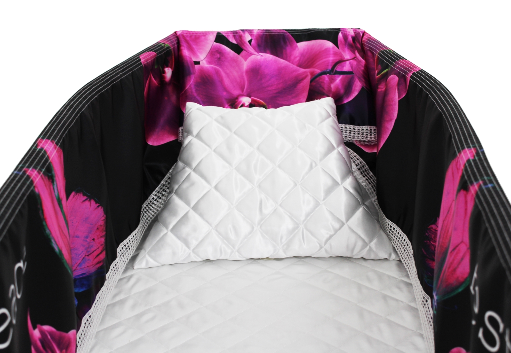 Luxury satin interior printed using water-based ink. The printed interior set consists of a 12-inch printed satin frill, printed satin facecloth, quilted satin pillow and a quilted satin mattress.