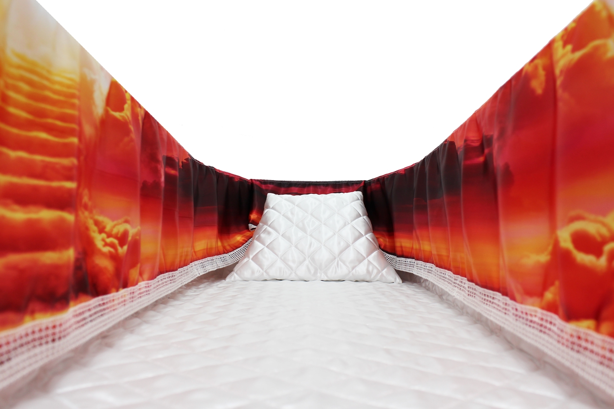 Luxury satin interior printed using water-based ink. The printed interior set consists of a 12-inch printed satin frill, printed satin facecloth, quilted satin pillow and a quilted satin mattress.